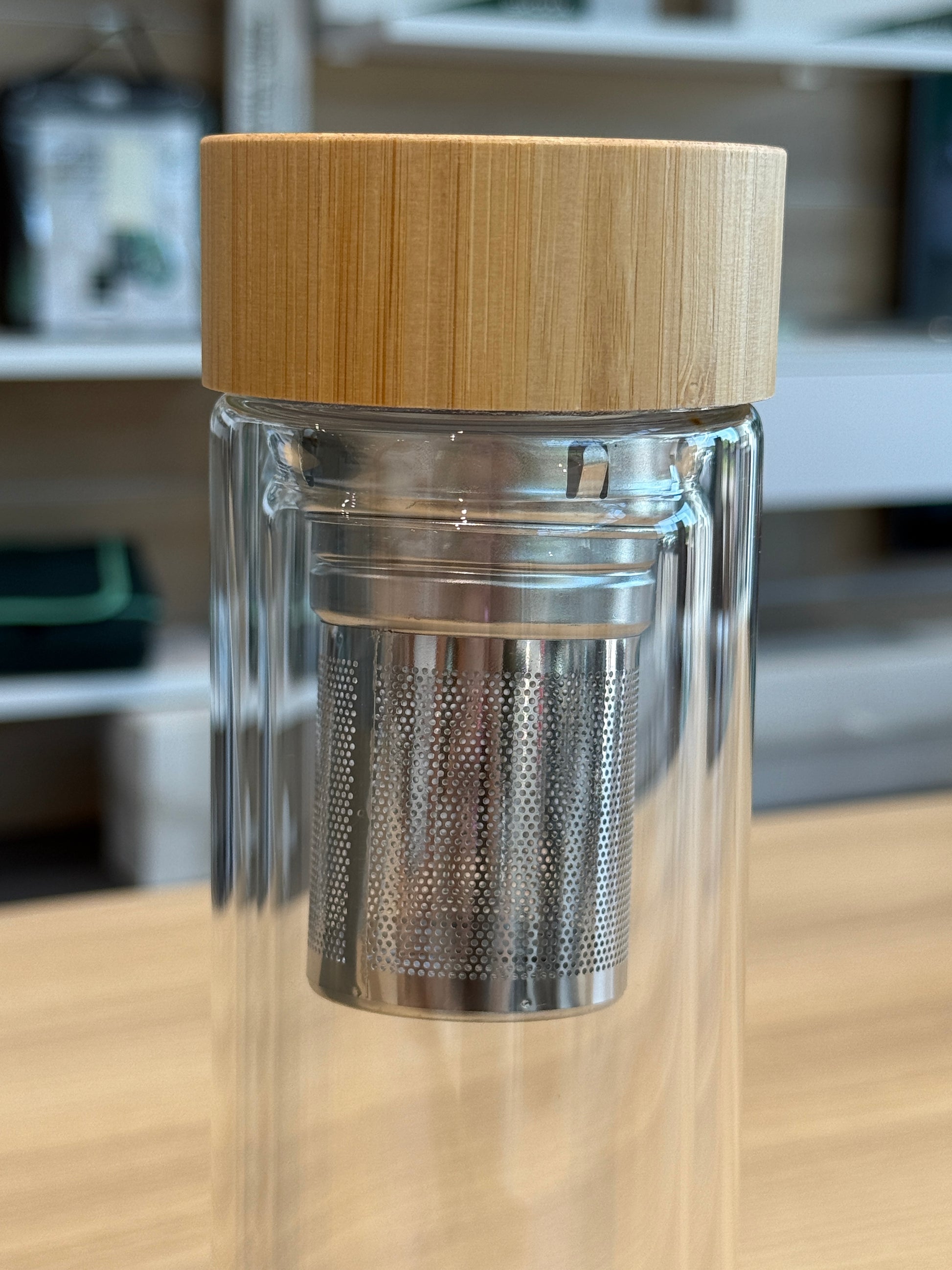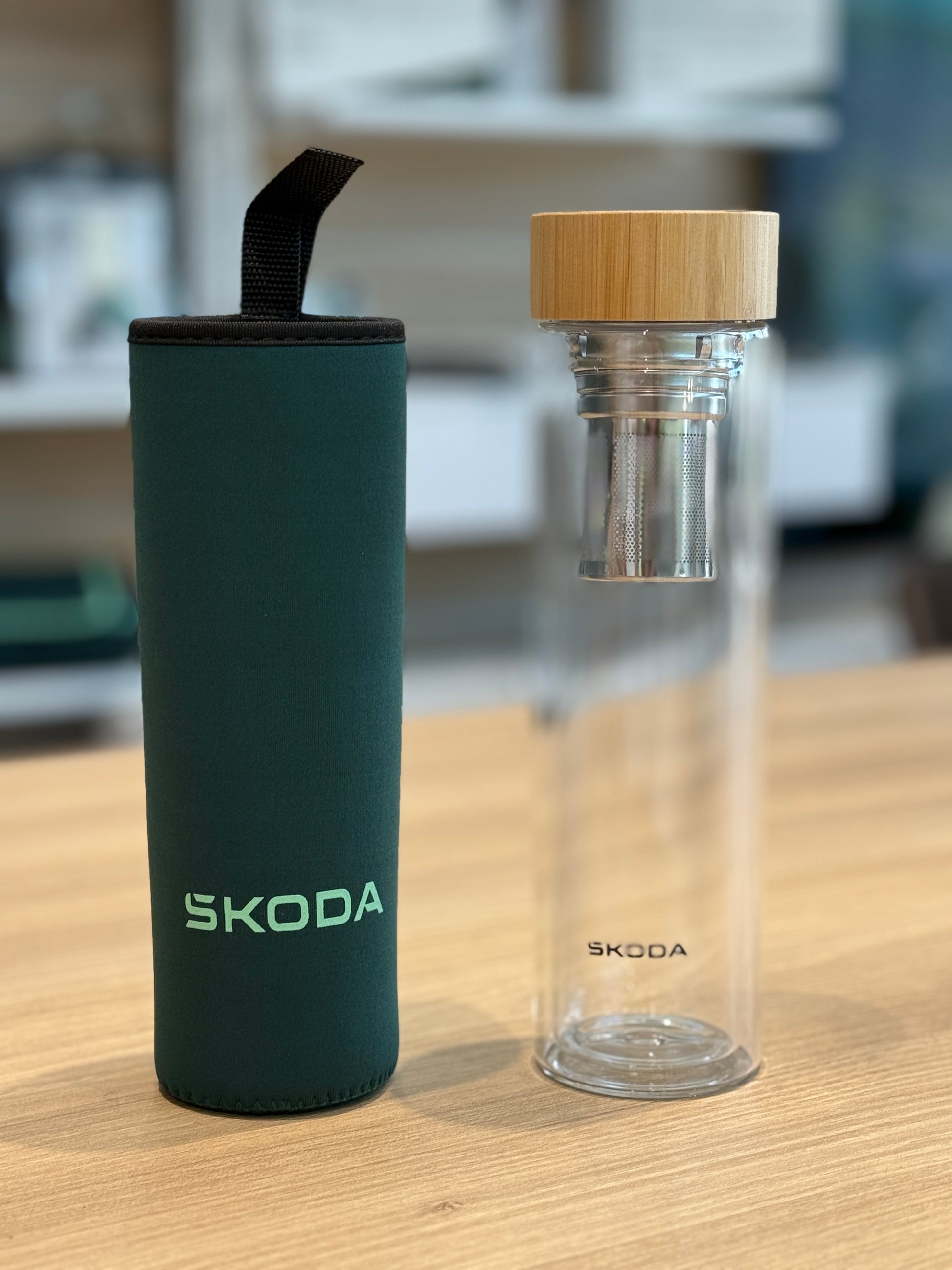 Bottiglia in vetro a doppia parente. Non adatta per lavastoviglie e microonde. Vetro resistente fino a 100gradi. Logo Skoda sulla bottiglia e sulla calza esterna per infusi