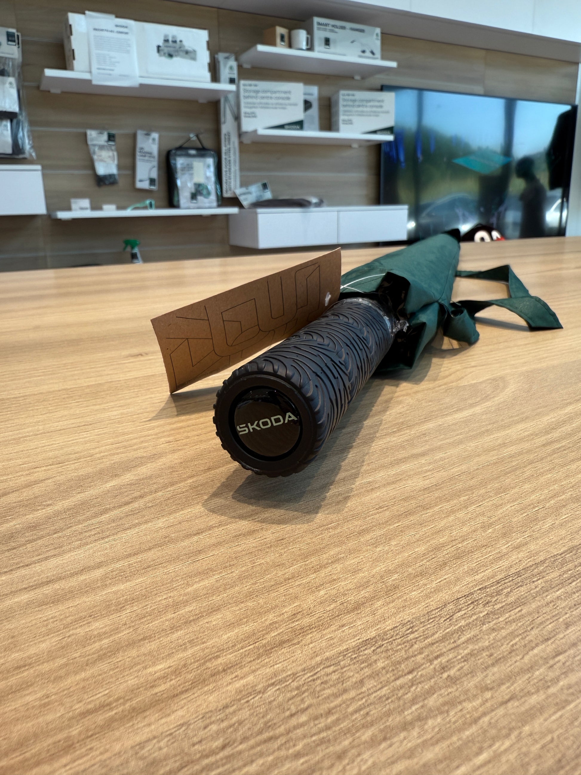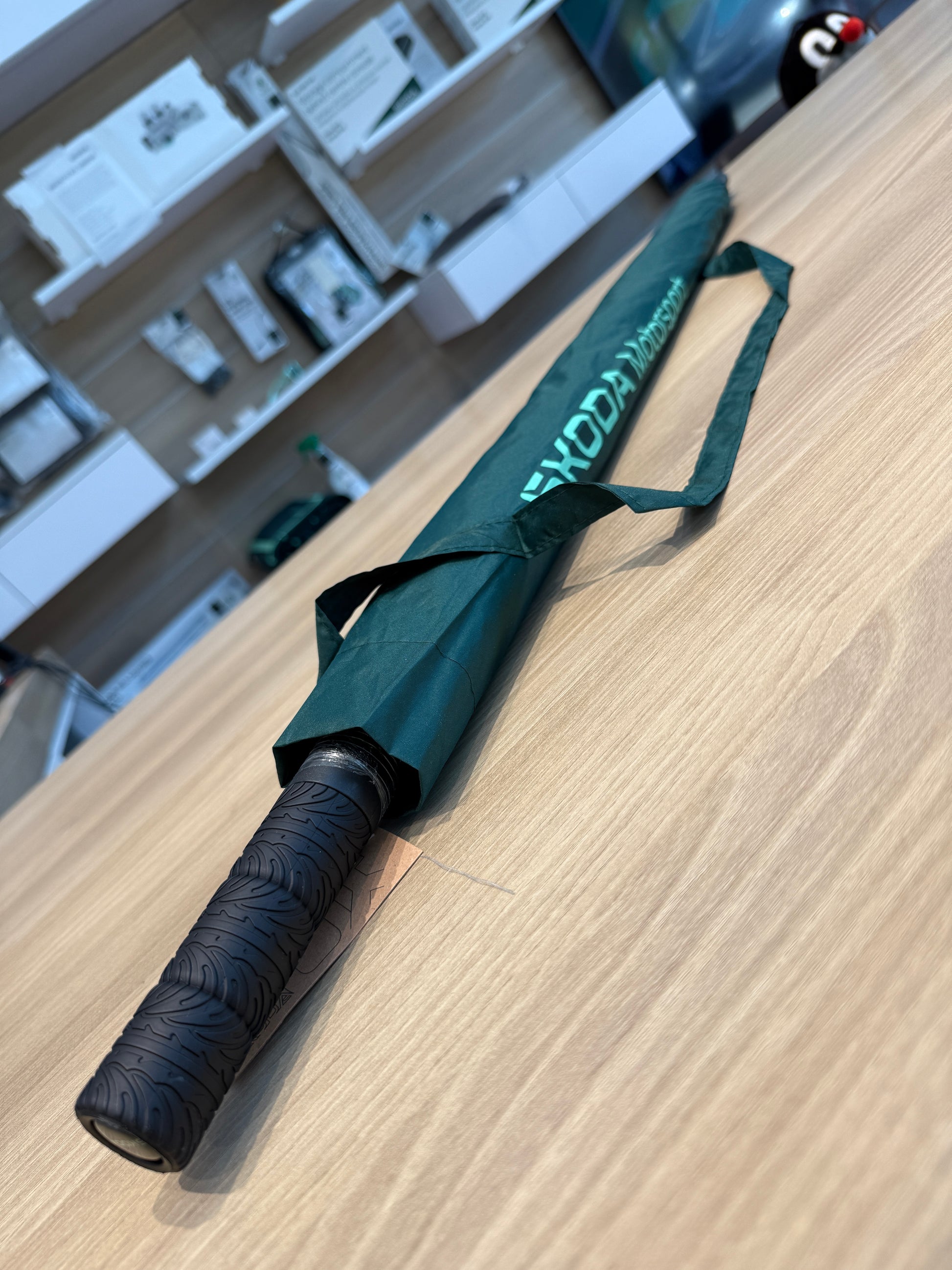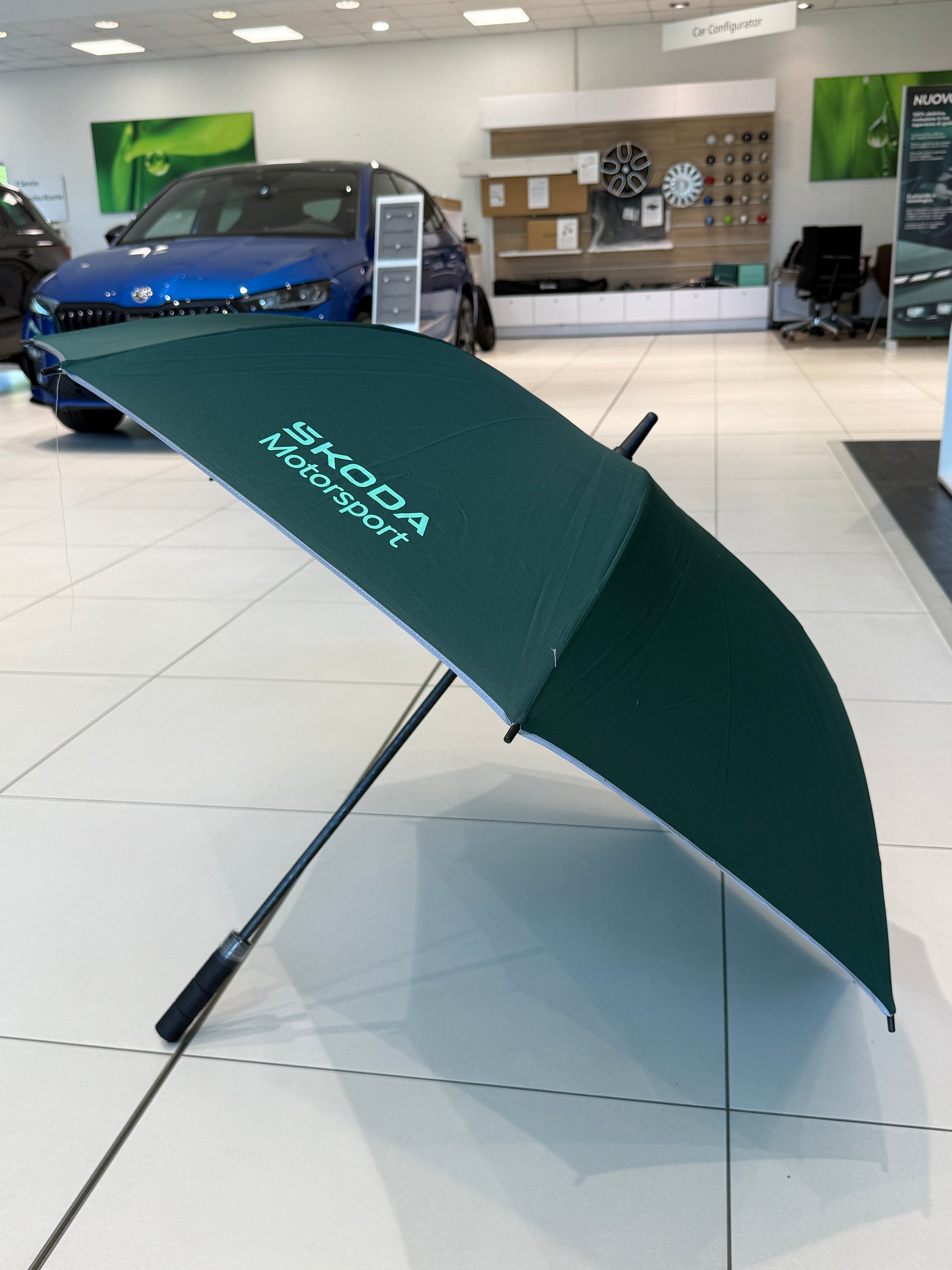 Ombrello con apertura automatica. Inclusa una pratica fondina per riposizionare l'ombrello. Elementi riflettenti e logo Skoda in verde elettrico